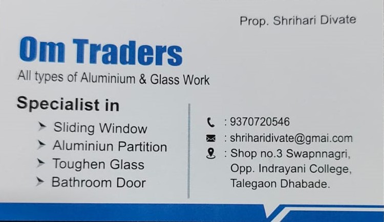 Om Traders is a trusted name in aluminium and glass fabrication, specializing in premium quality sliding windows, aluminium partitions, toughened glass installations, and modern bathroom doors. With years of expertise in the industry, we deliver custom solutions for both residential and commercial projects in Talegaon Dabhade and surrounding areas.